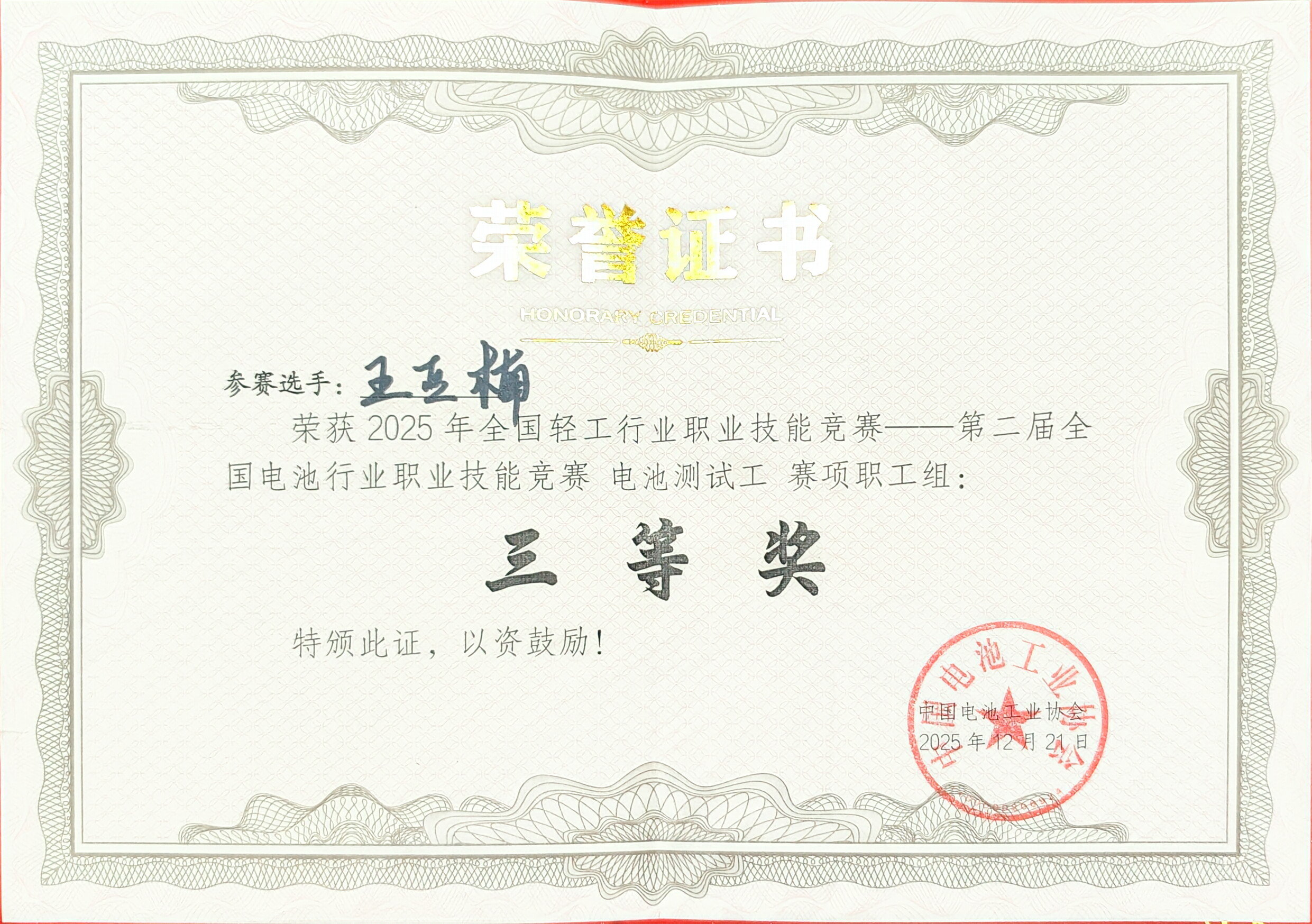 2025年12月21日,全国轻工行业职业技能竞赛——第二届全国电池行业职业技能竞赛“电池测试工”赛项全国决赛在深圳全至科技创新园圆满落幕。crown皇冠体育平台教师王亚楠历经层层选拔,从全国252名参赛选手中脱颖而出,最终以全国第13名的优异成绩斩获三等奖,展现了高校教师扎实的专业技能与行业实践能力。