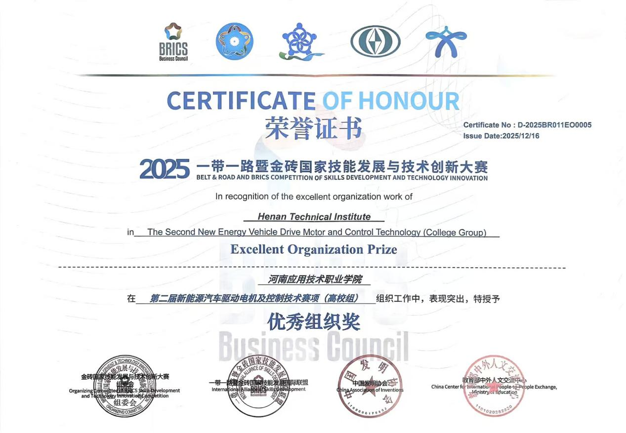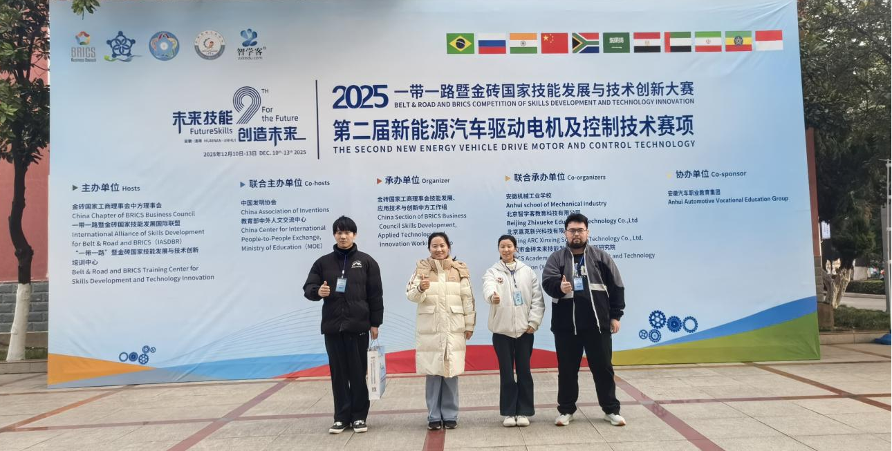 2025年12月11日-13日在安徽举办的2025年一带一路暨金砖国家技能发展与技术创新大赛—第二届新能源汽车驱动电机及控制技术赛项决赛中,我校crown皇冠体育平台师生团队凭借精湛技艺与稳定发挥,从全国266支强劲队伍中脱颖而出,荣获国赛二等奖、三等奖各一项,学校同时获评“优秀组织奖”。该赛事作为深化“一带一路”与金砖国家间技能发展与创新合作的重要平台,对推动新能源汽车领域国际技术交流、标准化人才培养具有深远意义。